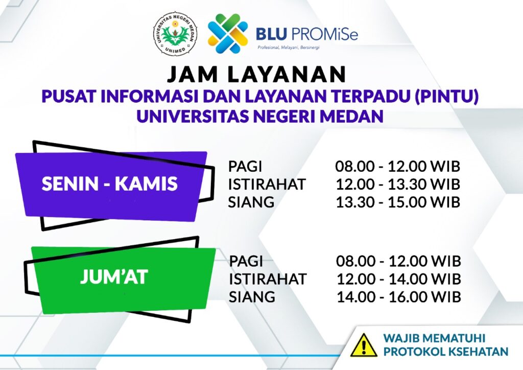 Mewujudkan hal tersebut dengan merujuk kepada Peraturan Presiden Nomor 97/2014 tentang penyelenggaraan pelayanan terpadu satu pintu, dan Peraturan Menteri Riset, Teknologi, dan Pendidikan Tinggi Nomor 59 Tahun 2016 tentang Pelayanan Publik. UNIMED membentuk Pusat Informasi dan Layanan Terpadu (PINTU) yang merupakan unit layanan terpadu di lingkungan universitas negeri medan.