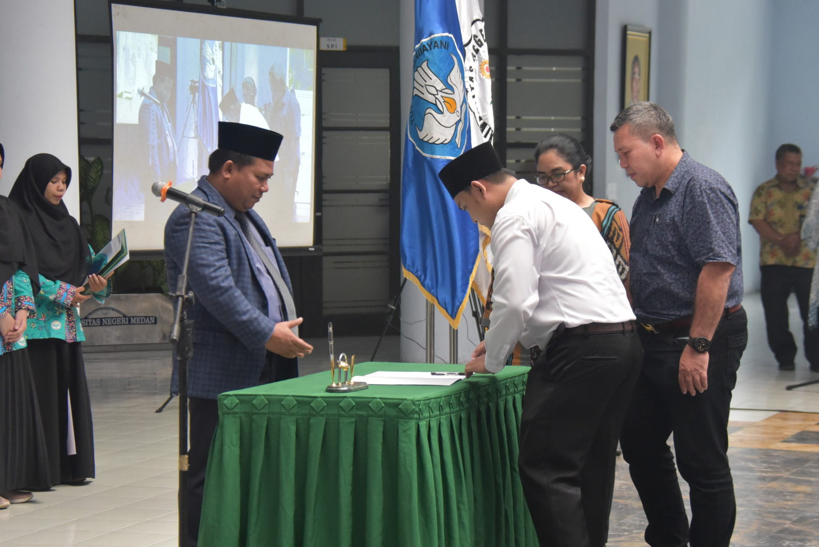 “Setelah dilantik sebagai PNS di Unimed hari ini, tetaplah belajar, mau berbenah diri dan senantiasa mengasah diri, agar dapat menjalankan tugas dan fungsinya di penempatan tugas Saudara. Bagunlah koordinasi, kolaborasi dan sinergi bersama agar saudara tetap berkinerja dan raih prestasi terbaik. Milikilah sikap pantang menyerah dan mental baja dalam menghadapi segala kesulitan dan tantangan dalam melaksanakan tugas sehari-hari. Sebab, kedepan tantangan bagi kita akan semakin kompleks, sehingga diperlukan kekuatan tekad dan kreativitas demi menciptakan alternatif solusi yang terbaik, tutup Rektor Prof. Syamsul Gultom. (Humas Unimed/zr)