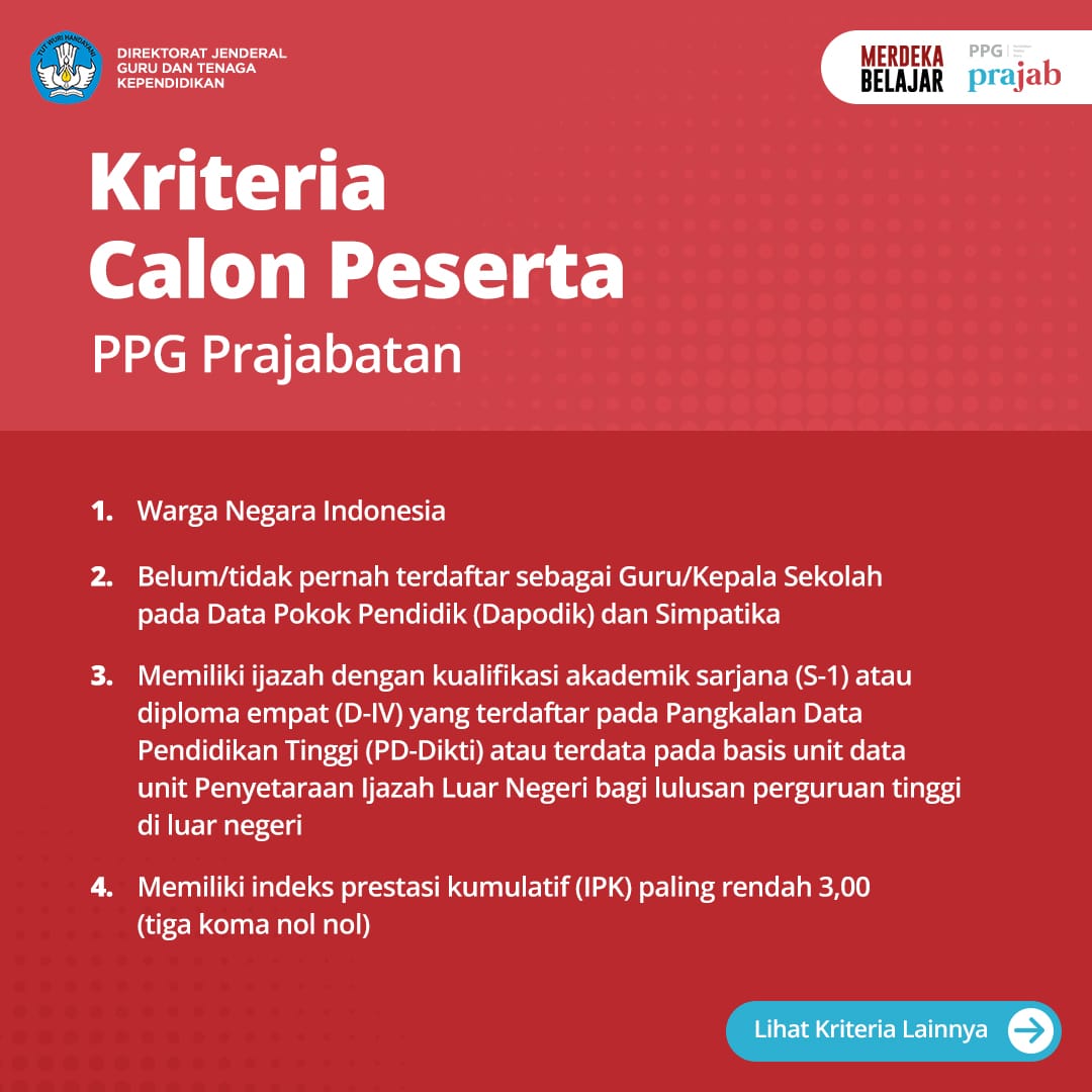 Pendaftaran PPG Prajabatan SUDAH DIBUKA, mulai tanggal 31 Mei s/d 25 Juni 2023. Simak terus informasi mengenai PPG Prajabatan 2023 melalui media sosial @ppgkemendikbud dan laman https://ppg.kemdikbud.go.id/prajabatan