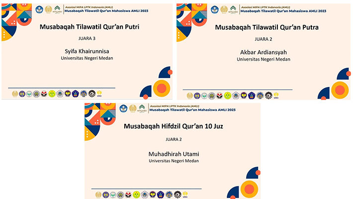 Mahasiswa FMIPA UNIMED berhasil meraih juara pada ajang perlombaan MTQ AMLI yang diselenggarakan oleh Universitas Negeri Surabaya pada 30 September – 1 Oktober 2023 secara daring. Adapun MTQ AMLI ini diadakan Demi menggembirakan rasa cinta terhadap AlQuran dan bertepatan dengan bulan kelahiran Baginda Nabi, kegiatan