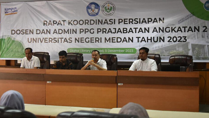 Dalam rangka mempersiapkan perkuliahan Program Pendidikan Profesi Guru (PPG) Prajabatan Angkatan 2 Tahun 2023, Universitas Negeri Medan melaksanakan rapat koordinasi dengan Kaprodi, Dosen dan Admin di Gedung Digital Library Unimed pada Senin (12/12/2023). Kegiatan ini dihadiri oleh 120 peserta dengan menghadirkan narasumber Mangaratua Marianus Simanjorang,
