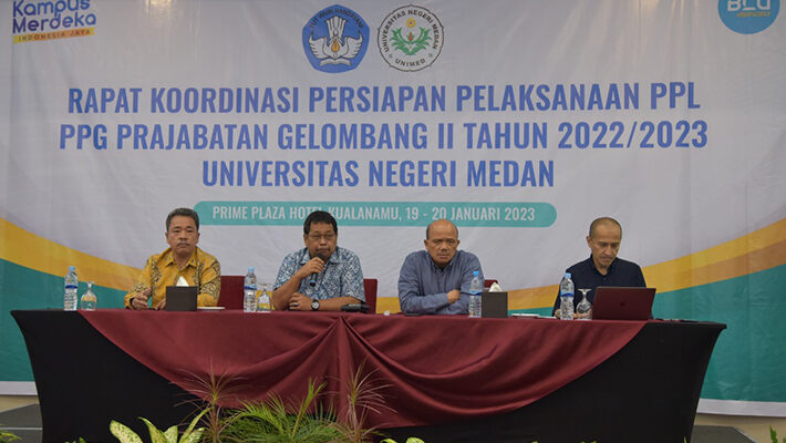 Universitas Negeri Medan menggelar Rapat Koordinasi Persiapan PPL PPG Prajab Gelombang II bersama puluhan Kepala Sekolah yang dilaksanakan di Hotel Prime Plaza Hotel Kualanamu, pada 19 – 20 Januari 2023. Turut hadir dalam acara tersebut, Wakil Rektor I Dr. Restu, M.S., Wakil Rektor III Prof.
