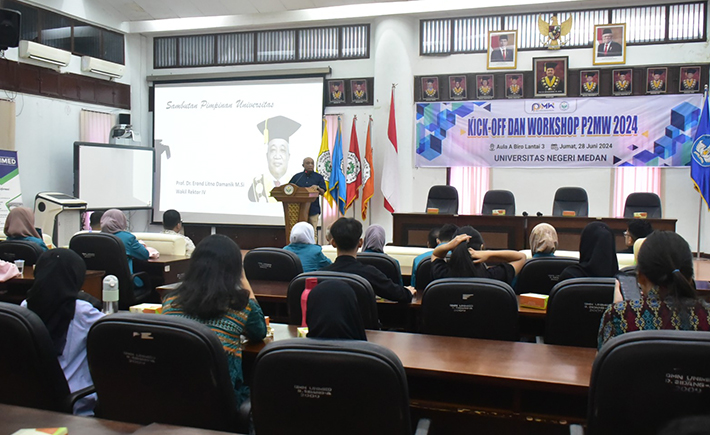 Kantor Wakil Rektor 3 Bidang Kemahasiswaan Universitas Negeri Medan menggelar acara Kick-Off dan Workshop Program Pembinaan Mahasiswa Wirausaha (P2MW) 2024 di Ruang Siang A Gedung Pusat Administrasi Unimed pada Jumat (28/06).