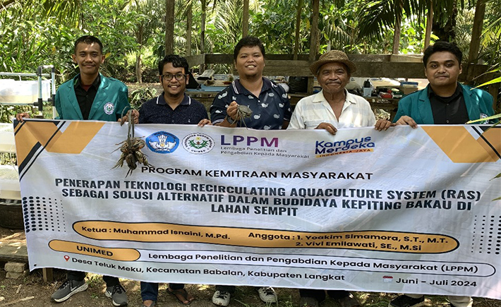 Tim dosen Universitas Negeri Medan (UNIMED) yang diketuai oleh Muhammad Isnaini, M.Pd., dengan anggota Yoakim Simamora, S.T., M.T. dan Vivi Emilawati, SE., M.Si, telah melaksanakan Program Kemitraan Masyarakat (PKM) di Desa Teluk Meku, Kecamatan Babalan, Kabupaten Langkat 13 Juli 2024 . Kegiatan ini bertajuk “Penerapan Teknologi Recirculating Aquaculture System (RAS) Sebagai Solusi Alternatif dalam Budidaya Kepiting Bakau di Lahan Sempit”.
