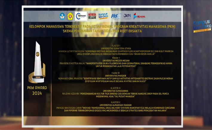 Prestasi gemilang kembali ditorehkan oleh mahasiswa FMIPA Universitas Negeri Medan (UNIMED). Tim mahasiswa yang dipimpin oleh Fransiskus Hottua Malau, jurusan Kimia, berhasil meraih penghargaan bergengsi sebagai Tim Ter-kreatif klaster II pada ajang Program Kreativitas Mahasiswa (PKM) bidang Riset Eksakta 2024. Penghargaan ini diserahkan langsung oleh Direktorat Jenderal Pembelajaran dan Kemahasiswaan (Belmawa) Kementerian Pendidikan, Kebudayaan, Riset dan Teknologi (Kemdikbudristek) yang berlangsung secara daring pada Senin, 19 Agustus 2024.