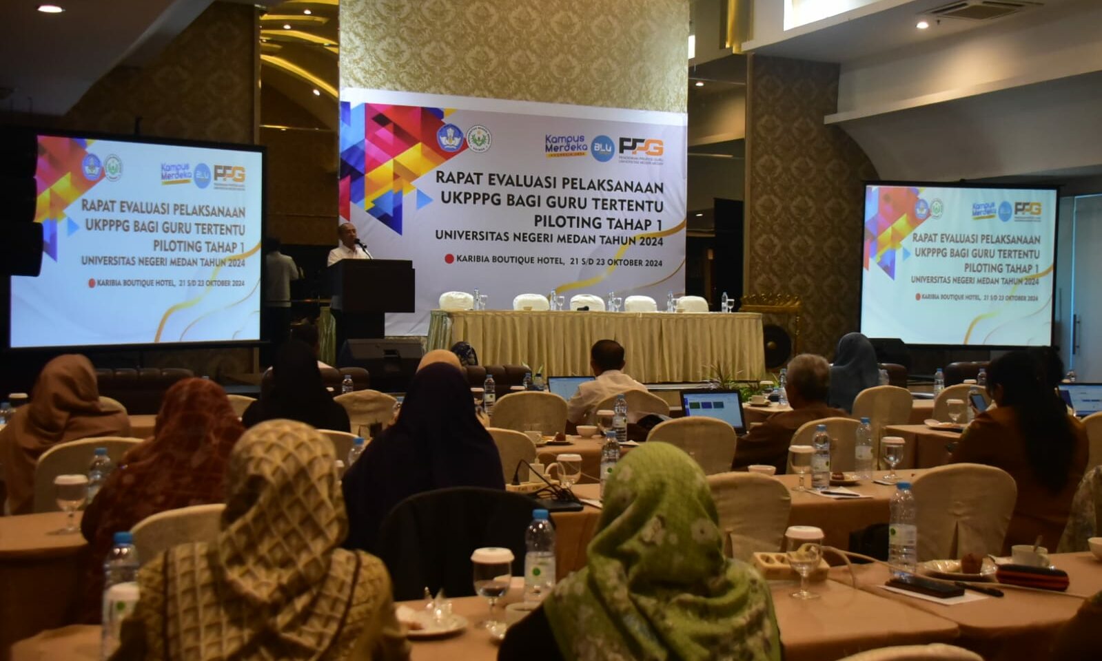 Universitas Negeri Medan (Unimed) menggelar rapat evaluasi pelaksanaan UKPPPG bagi guru tertentu piloting tahap 1 Universitas Negeri Medan Tahun 2024 di Karibia Boutiq Hotel pada 21 – 23 Oktober 2024. Acara ini dibuka oleh Wakil Rektor I Unimed dan diikuti oleh guru pamong 17 orang, kaprodi dan kajur 32 orang, dan panitia 31 orang.