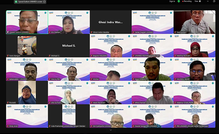 LPPM Unimed menggelar kegiatan panduan penelitian dan Pengabdian Kepada Masyarakat PNBP Unimed Tahun Anggaran 2024 secara daring pada Selasa (24/12). Acara tersebut dibuka oleh Rektor Unimed Prof. Dr. Ir. Baharuddin, ST., M.Pd. Dengan narasumber Prof. Dr. Syawal Gultom, M.Pd. (Ketua Senat Unimed) dan Dr. Hesti Fibriasari, S.Pd., M.Hum. (Ketua LPPM Unimed).
