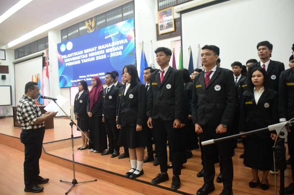 Rektor Universitas Negeri Medan Prof. Dr. Baharuddin, M.Pd., melantik 40 orang pengurus Senat Mahasiswa (SEMA) Unimed periode 2025/2026, yang dilaksanakan di ruang sidang A Biro Rektor Unimed pada Selas , (18/02/2025).