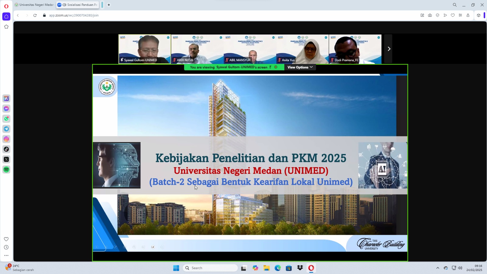 LPPM Unimed menggelar kegiatan Sosialisasi Panduan Penelitian dan Pengabdian 2025 Batch 2 secara daring pada Senin (24/02). Acara tersebut dibuka oleh Wakil Rektor I Unimed Dr. Abil Mansyur, S.Si., M.Si. Dengan narasumber Prof. Dr. Syawal Gultom, M.Pd. (Ketua Senat Unimed) dan Dr. Hesti Fibriasari, S.Pd., M.Hum. (Ketua LPPM Unimed).