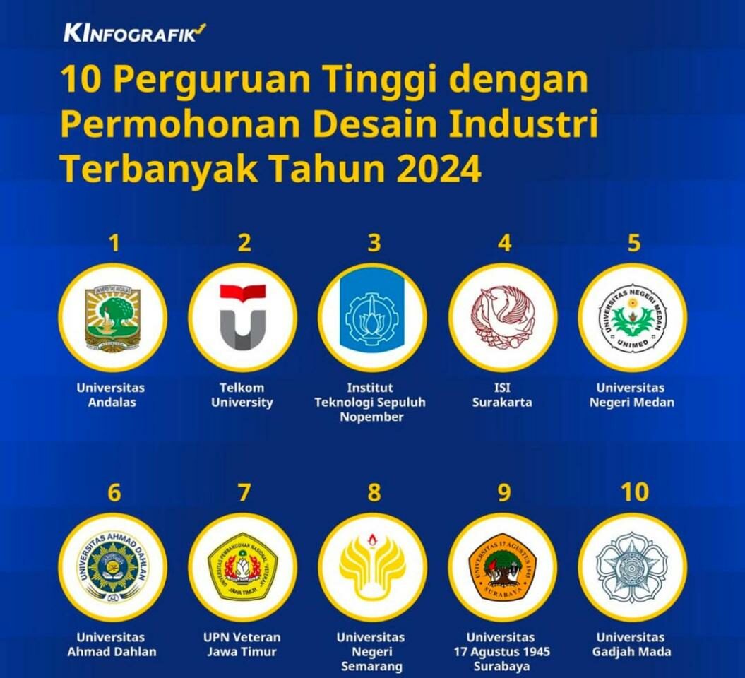 Direktorat Jenderal Kekayaan Intelektual Kementerian Hukum Republik Indonesia pada hari senin tanggal 24 februari 2025 telah mengumumkan Perguruan Tinggi dengan permohonan Desain Industri terbanyak Tahun 2024 di akun media sosialnya @djki_kemenkum. Berdasarkan postingan tersebut Universitas Negeri Medan berhasil memperoleh hasil yang gemilang dimana UNIMED menempati posisi 5 besar dari 10 perguruan tinggi dengan jumlah permohonan desain industri terbanyak di Indonesia pada tahun 2024.