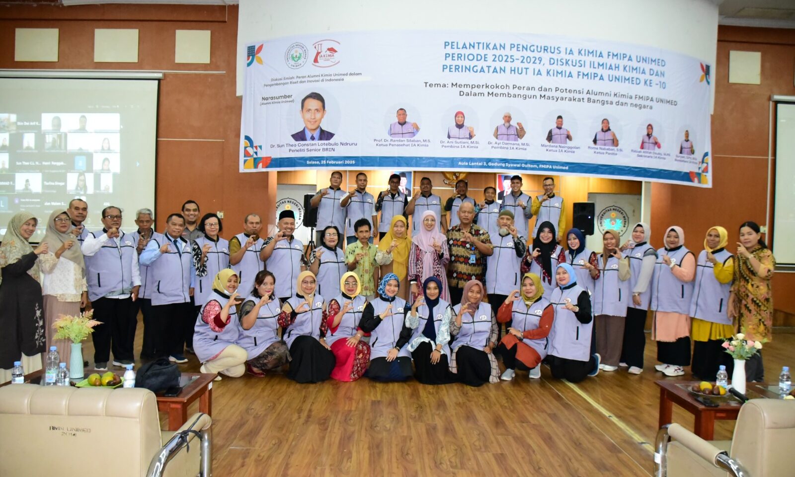 Ikatan Alumni Kimia Universitas Negeri Medan ( IA-KIMIA UNIMED) Melakukan Pelantikan Pengurus Periode 2025-2029. Dan diskusi Ilmiah Kimia dan Peringatan HUT IA Kimia FMIPA Unimed ke-10 Dengan mengangkat Tema : Memperkokoh peran dan potensi alumni kimia FMIPA Unimed membangun masyarakat bangsa dan Negara.Kegiatan ini dilakukan secara Luring dan daring di Aula Lantai 3, Gedung Syawal Gultom,Fmipa Unimed. menghadirkan narasumber Dr. Sun Theo Constan Lotebulo Ndruru ( Peneliti Senior BRIN).