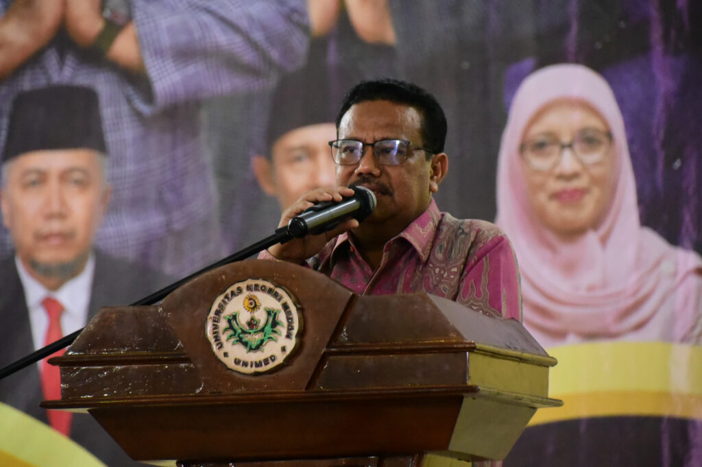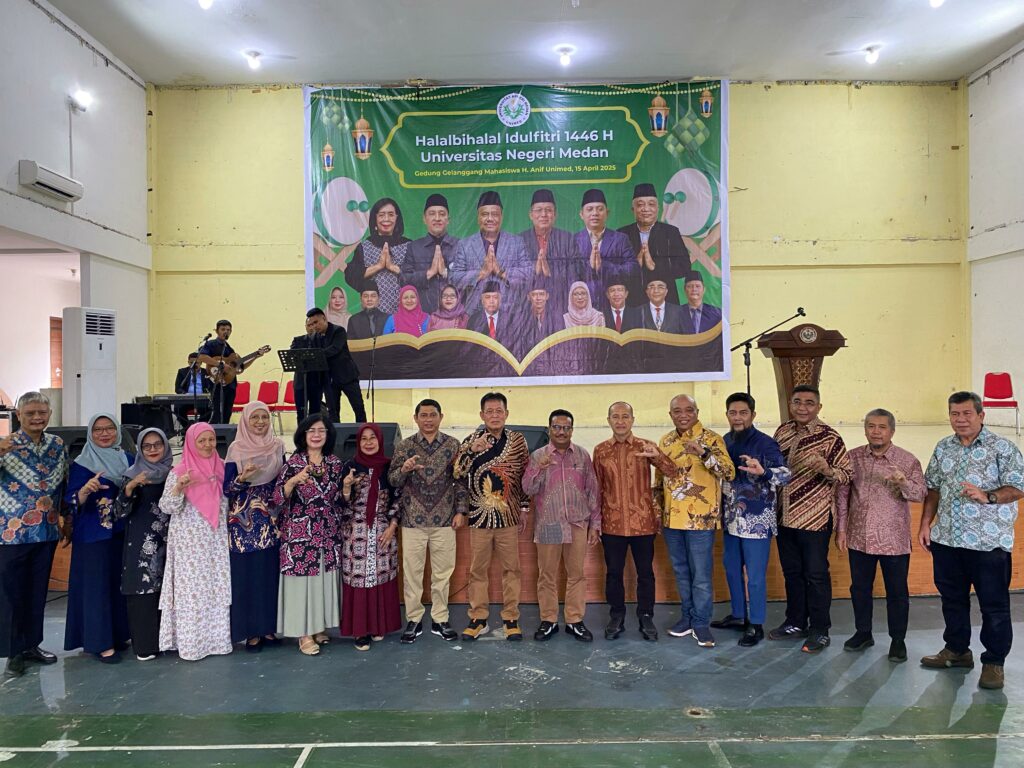Universitas Negeri Medan (Unimed) menggelar acara Halalbihalal Idulfitri 1446 H pada Selasa (15/04/25) di Gedung Haji Anif Unimed. Acara ini dihadiri oleh seluruh pimpinan dan seluruh sivitas akademika Unimed. Hadir Rektor Unimed, Ketua Senat, Sekretaris Senat, Wakil Rektor, Dekan, Direktur PPs, Ketua Lembaga dan Kepala Biro di lingkungan Unimed dan suluruh warga Unimed, dari dosen, darma wanita, tenaga kependidikan tim keamanan dan kebersihan Universitas Negeri Medan.