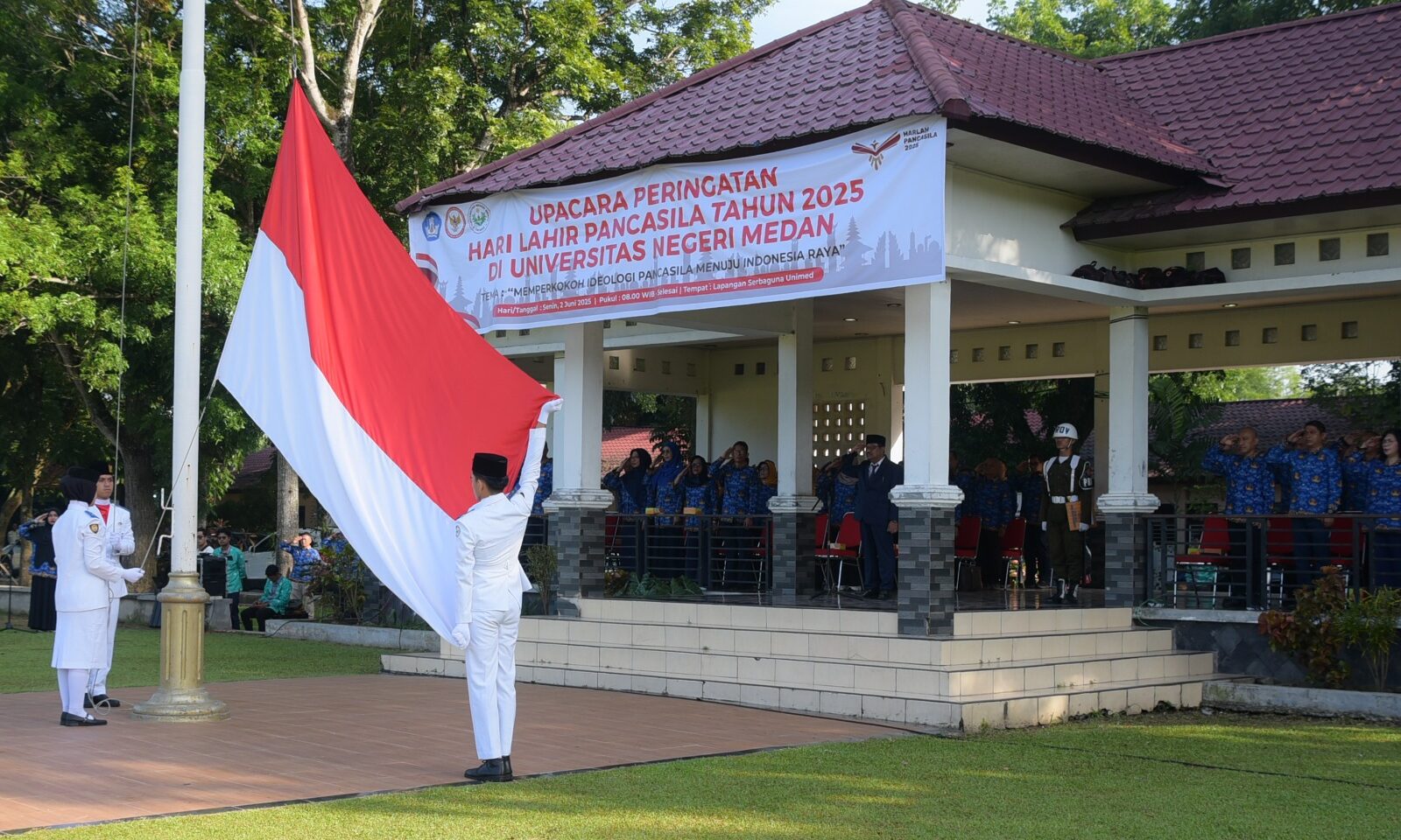 Rektor Unimed, Prof. Dr. Ir. Baharuddin, ST., M.Pd., bertindak sebagai pembina upacara dan membacakan Pidato Kepala Badan Pembinaan Ideologi Pancasila (BPIP). Dalam pidatonya, Di tengah tantangan zaman yang semakin kompleks, baik dari segi politik, sosial, budaya, maupun teknologi, memperkokoh ideologi Pancasila menjadi suatu keharusan. Pancasila sebagai ideologi terbuka dan dinamis, mampu beradaptasi dengan perkembangan zaman tanpa kehilangan esensi nilai-nilainya. Memperkokoh Pancasila berarti menanamkan kembali rasa cinta tanah air, rasa persatuan, serta penghormatan terhadap kemanusiaan dan keadilan. Ini adalah fondasi agar masyarakat Indonesia tidak terpecah oleh perbedaan suku, agama, ras, dan golongan.