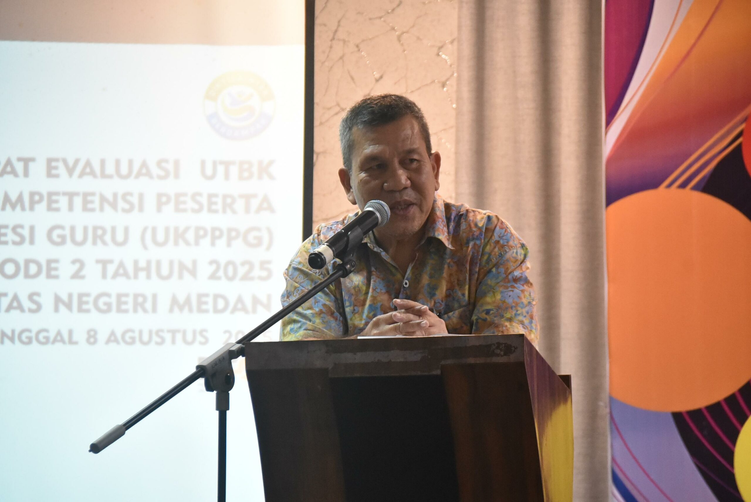 Universitas Negeri Medan (Unimed) menggelar Rapat Evaluasi Ujian Tulis Berbasis Komputer (UTBK) Uji Kompetensi Peserta Pendidikan Profesi Guru (UKPPPG) Daring Domisili Periode 2 Tahun 2025.