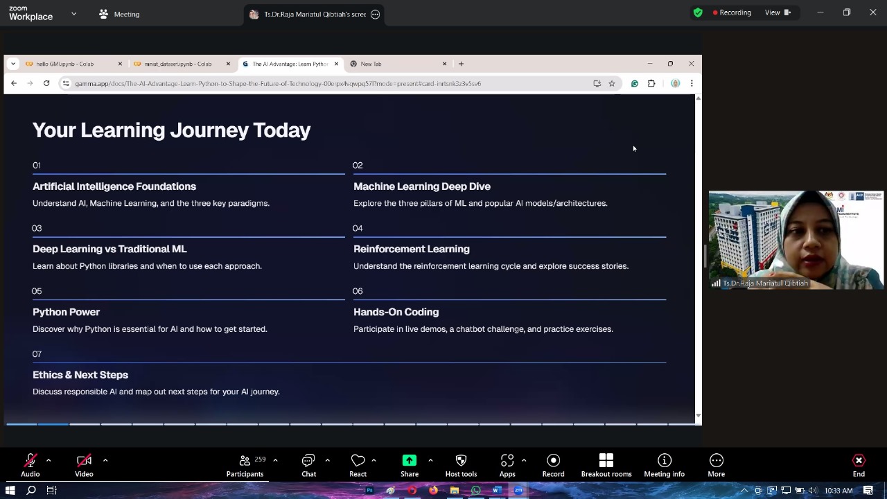 Dr. Raja Mariatul juga menjelaskan penggunaan bahasa Python telah banyak digunakan sebagai bahasa pemograman untuk pengembangan AI karena sintaksnya yang sederhana, dukungan library yang kuat, dan telah menjadi standar industri.