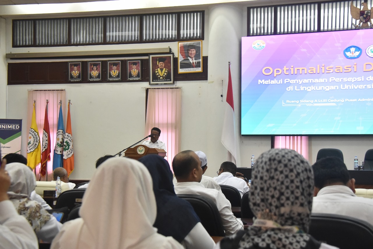 Dalam sambutannya, Rektor Unimed Prof. Baharuddin menekankan bahwa optimalisasi data PDDIKTI merupakan tanggung jawab bersama seluruh sivitas akademika. “Optimalisasi data PDDIKTI merupakan tanggung jawab bersama, bukan hanya pada unit tertentu. Oleh karena itu, diperlukan kesadaran kolektif, koordinasi yang efektif, serta komitmen dari seluruh unsur sivitas akademika untuk memastikan pengelolaan data yang valid, reliabel, konsisten, dan terkini,” ujarnya.