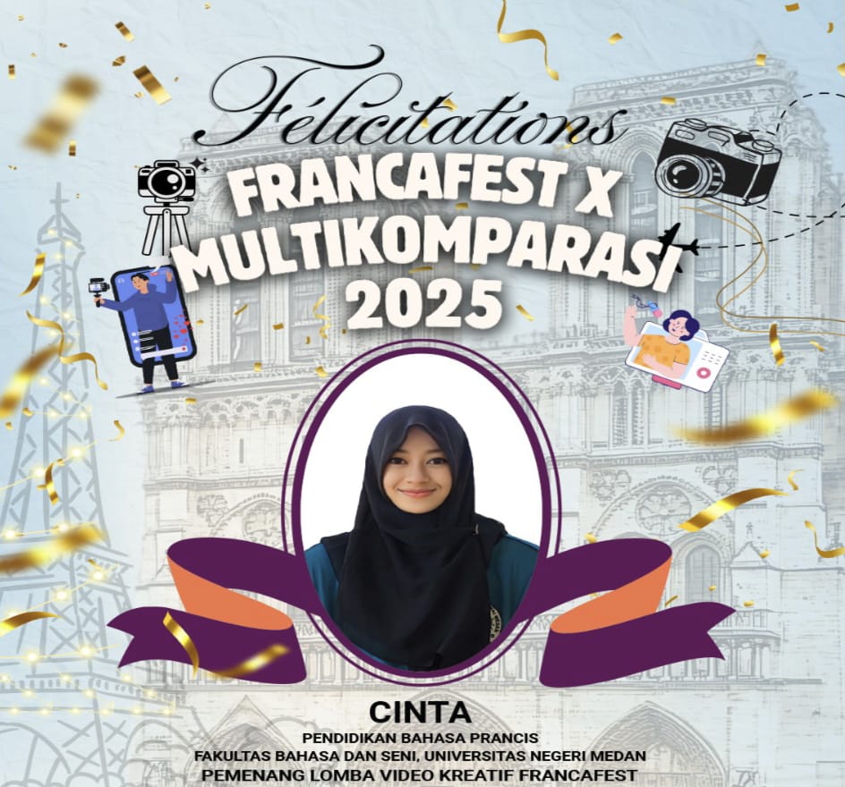 Kabar membanggakan datang dari Fakultas Bahasa dan Seni Universitas Negeri Medan (UNIMED). Cinta, mahasiswa Program Studi Pendidikan Bahasa Prancis, berhasil meraih Juara 2 Lomba Video Kreatif Promosi Program Studi Prancis pada ajang bergengsi Francafest x Multikomparasi IMASPI 2025.