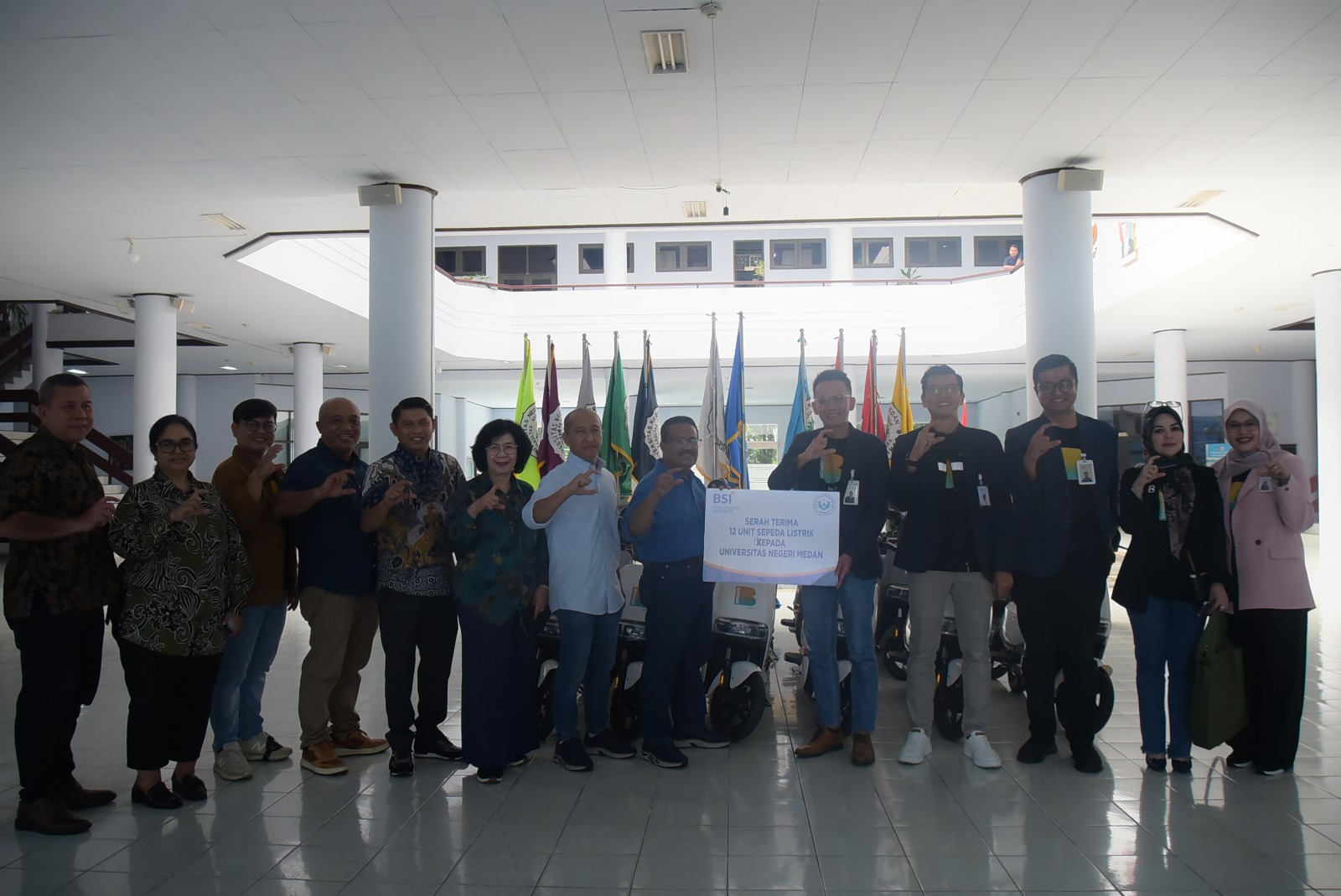 Univesitas Negeri Medan (Unimed) menerima hibah berupa 12 Unit sepeda listrik dari Bank Syariah Indonesia (BSI) sebagai bentuk dukungan terhadap program kampus hijau (green campus) dan pengurangan emisi karbon di lingkungan pendidikan tinggi. Serah terima berlangsung di Gedung Biro Rektor Unimed pada (07/11).