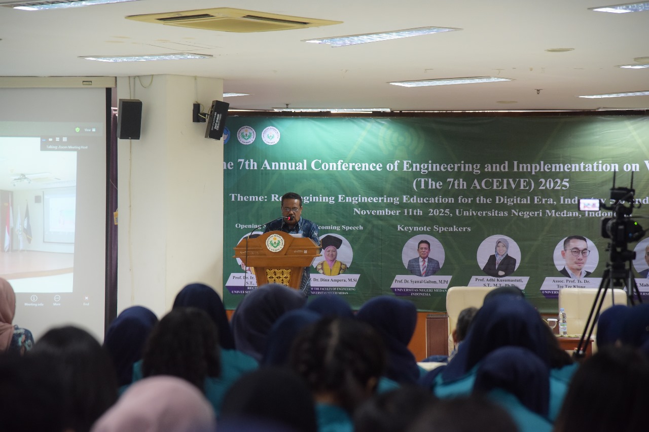 Fakultas Teknik Universitas Negeri Medan menyelenggarakan Konferensi Internasional The 7th Annual Conference of Engineering and Implementation on Vocational Education (ACEIVE 2025) secara daring melalui virtual zoom meeting dan luring di Aula Lt. IV Digital Library Unimed, pada Selasa (11/11). The 7th ACEIVE mengangkat tema : “Reimaging Engineering Education for the Digital Era Industry 5.0 and a Sustainable Future”.