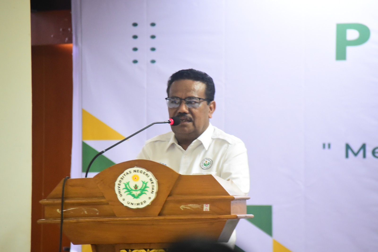 Dalam sambutannya Rektor Unimed Prof. Dr. Ir. Baharuddin, S.T., M.Pd., menyampaikan kita semua tahu bahwa Indonesia sedang mempersiapkan diri menuju Indonesia Emas 2045. Itu artinya, di tahun tersebut kalianlah yang akan menjadi motor utama pembangunan: menjadi profesional, pelaku ekonomi, inovator, pengusaha, dan bahkan pemimpin bangsa. Karena itu, kemampuan akademik saja tidak cukup. Yang tidak kalah penting adalah karakter: integritas, disiplin, kemampuan bekerja sama, berpikir positif, dan siap menghadapi perubahan. Saya berharap kegiatan hari ini dapat menjadi ruang refleksi bagi kita semua. Membangun karakter bukan pekerjaan sehari dua hari, tapi proses panjang yang dimulai dari hal-hal sederhana: datang tepat waktu, jujur dalam mengerjakan tugas, menghargai perbedaan pendapat, dan bertanggung jawab atas keputusan yang diambil. Kebiasaan kecil itulah yang nantinya membentuk pribadi besar