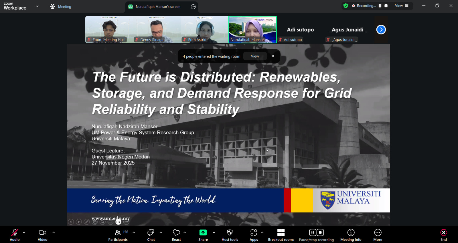 Kuliah Tamu Internasional kali ini mengangkat topik yang sangat vital dan menjadi fokus utama transisi energi global, yaitu “The Future Is Distributed: Renewables, Storage, and Demand Response for Grid Reliability and Stability.” Kegiatan ini secara khusus menghadirkan pakar dari negeri jiran, Dr. Nurulafiqah Nadzirah Binti Mansor, Dosen dan Peneliti dari Departemen Teknik Elektro, Fakulti Kejuruteraan, Universiti Malaya, sebagai narasumber utama. Acara dipandu oleh Erita Astrid, S.T., M.S., salah satu dosen dari Program Studi Teknik Elektro Unimed yang bertindak sebagai moderator.