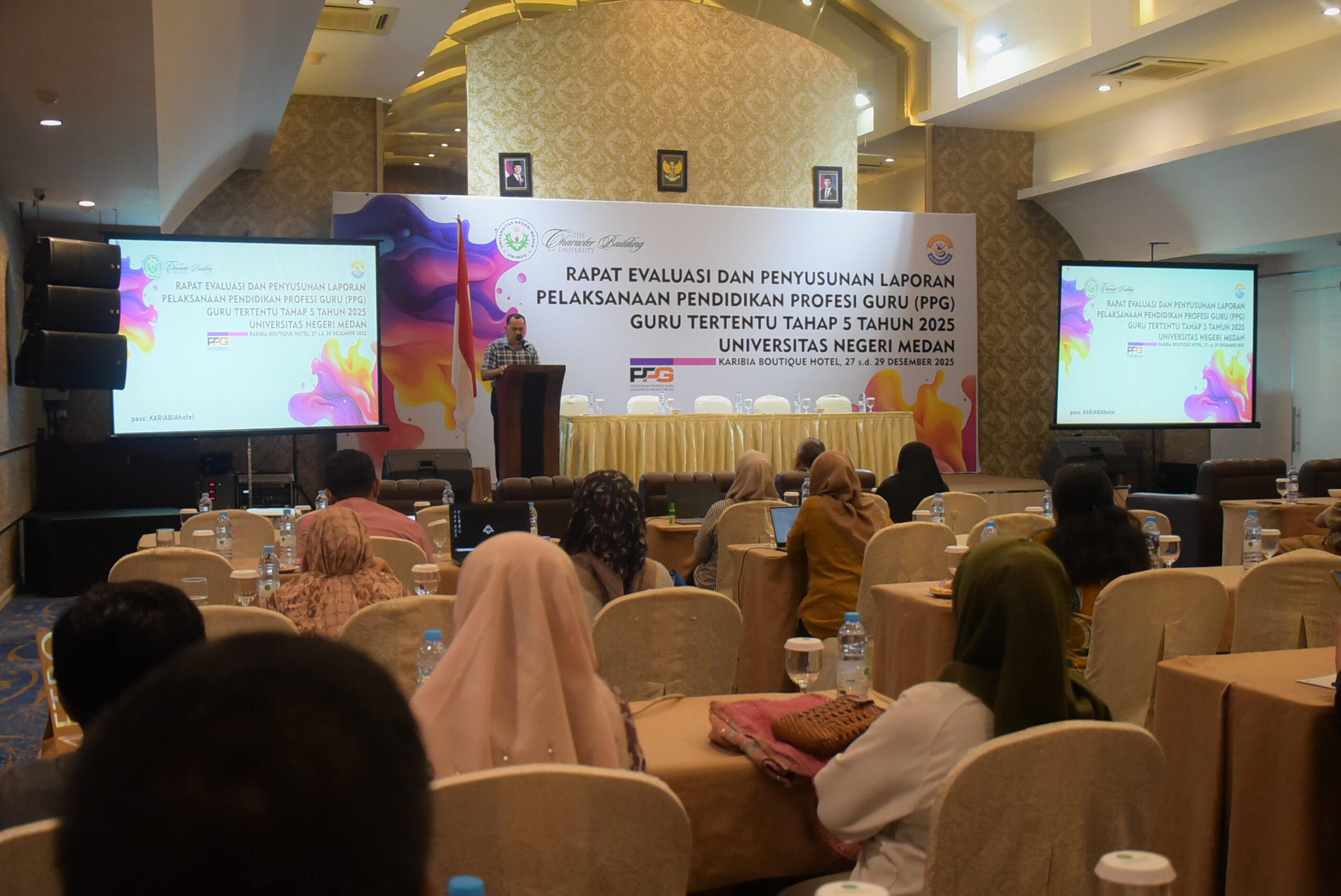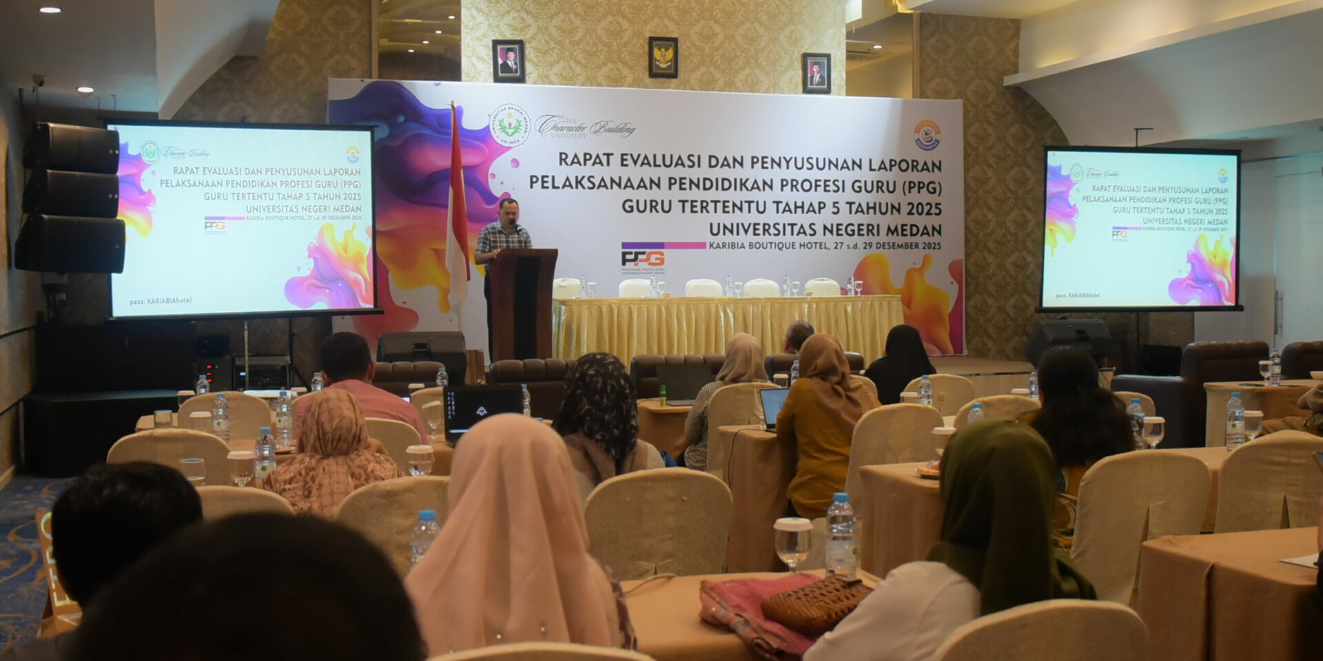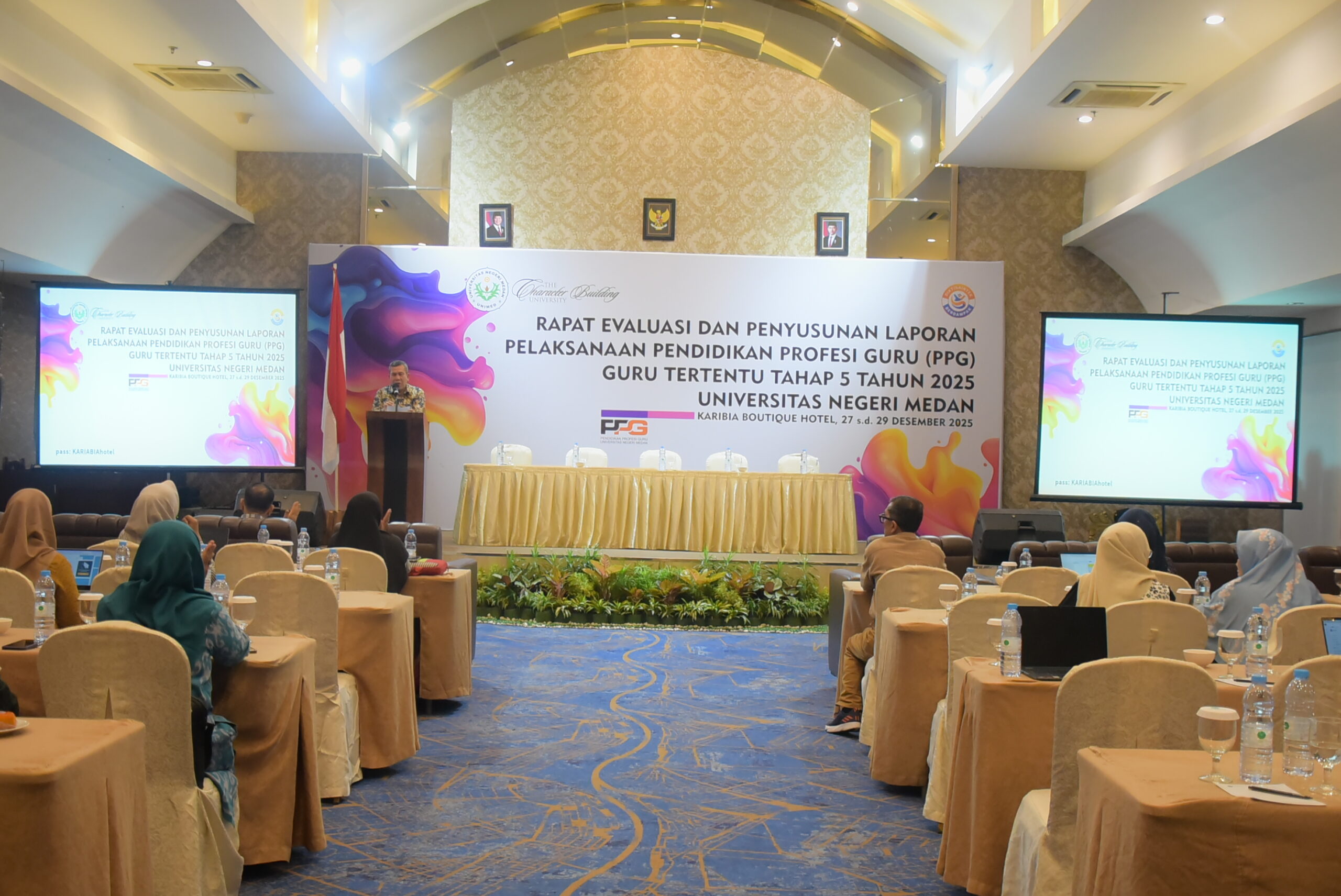 Universitas Negeri Medan (Unimed) melakukan Rapat Evaluasi dan Penyusunan Laporan Pelaksanaan Program Pendidikan Profesi Guru (PPG) bagi Guru Tertentu Tahap 5 Tahun 2025. Kegiatan ini berlangsung selama tiga hari, pada 27 – 29 Desember 2025, bertempat di Karibia Boutique Hotel, Medan.