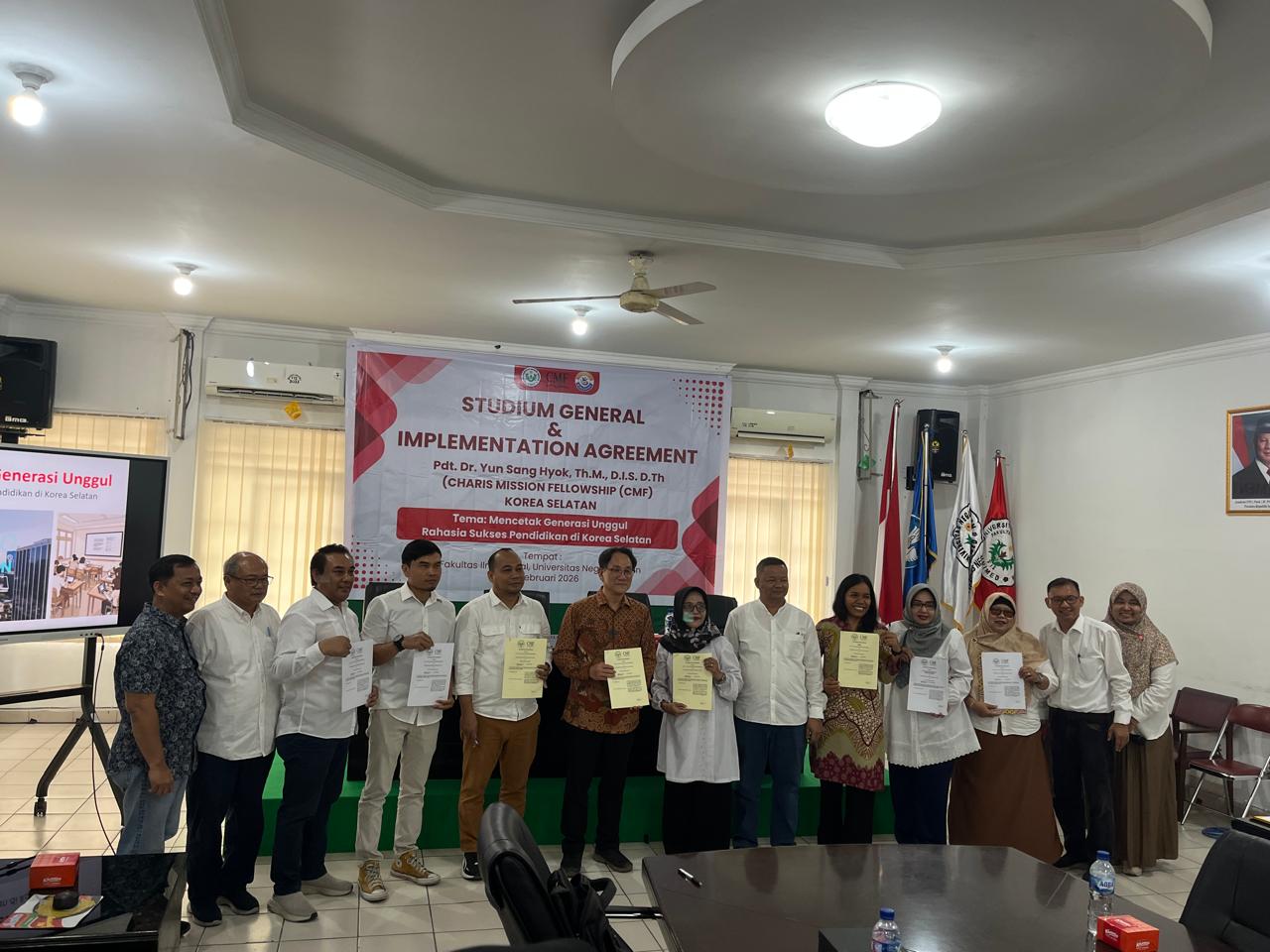Fakultas Ilmu Sosial Universitas Negeri Medan (FIS Unimed) menyelenggarakan kegiatan Stadium General yang dirangkaikan dengan penandatanganan Implementation Agreement (IA) bersama Charis Mission Fellowship (CMF) Korea Selatan pada Senin, 9 Februari 2026. Kegiatan tersebut dilaksanakan di Ruang Sidang Lantai III Fakultas Ilmu Sosial Universitas Negeri Medan dan diikuti oleh sivitas akademika di lingkungan FIS.