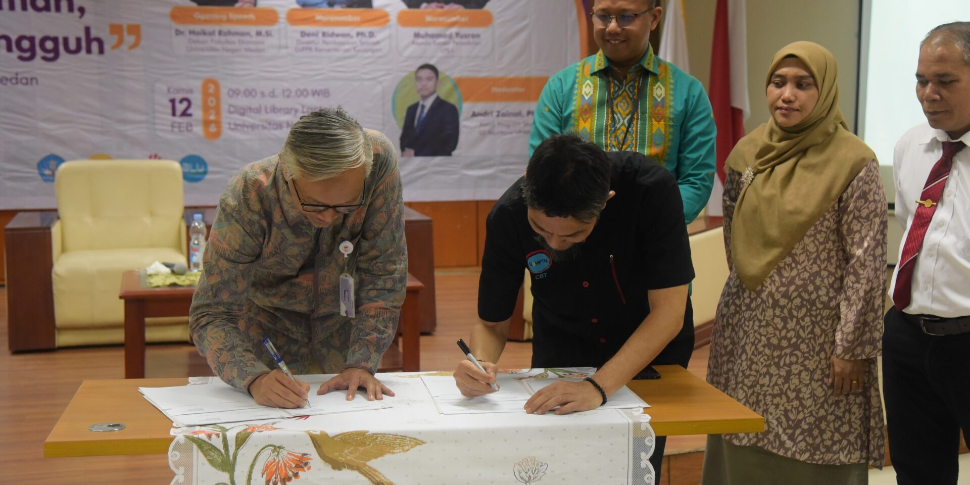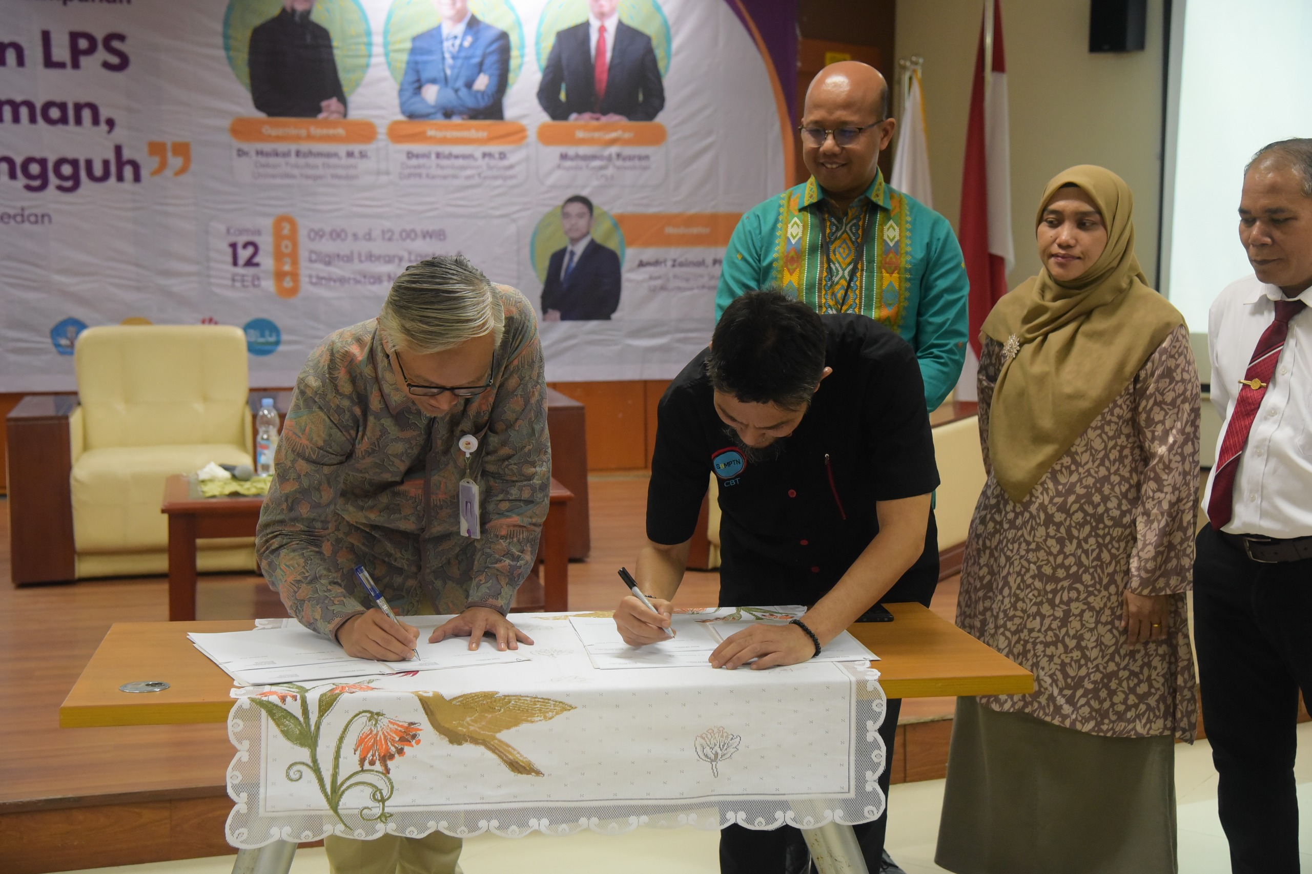 Di akhir acara dilakukan penandatanganan Implementation Aggrement (IA) antara FE UNIMED dengan DJPPR Kemenkeu dan LPS.(Humas Unimed/zr)