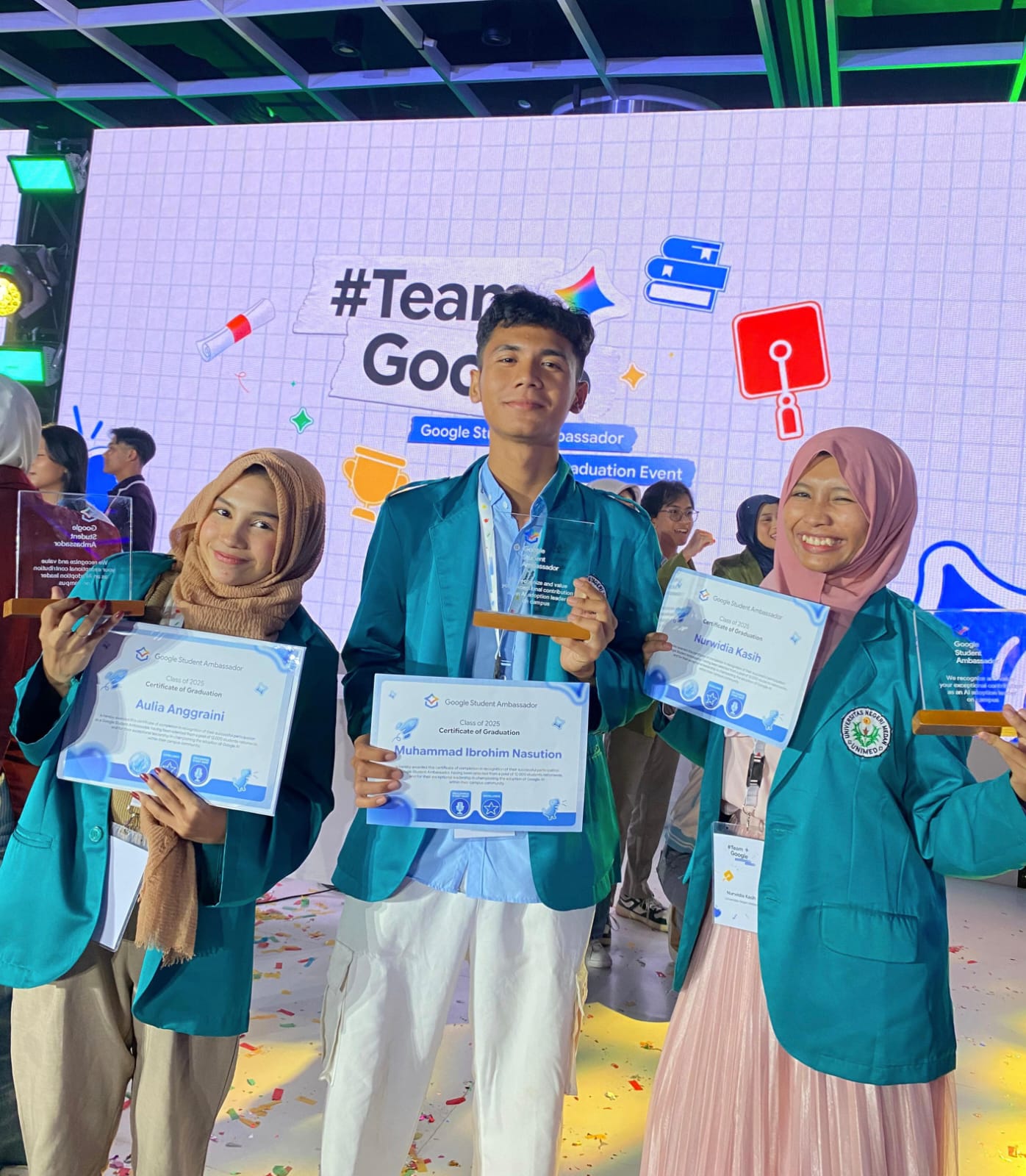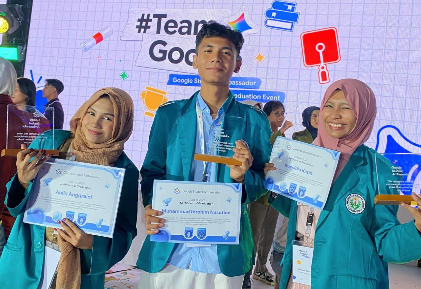 Universitas Negeri Medan (Unimed) kembali mencatatkan prestasi gemilang di tingkat nasional. Tiga mahasiswa Unimed, Aulia Anggraini Mahasiswa Pendidikan Bahasa Inggris, Nurwidia Kasih Pendidikan Bahasa Inggris, dan Muhammad Ibrohim Nasution Mahasiswa Matematika, terpilih menjadi Google Student Ambassador dan mendapatkan undangan resmi untuk menghadiri Graduation Google Student Ambassador (GSA), sebuah agenda puncak dan eksklusif dari program Google Student Ambassador Indonesia.