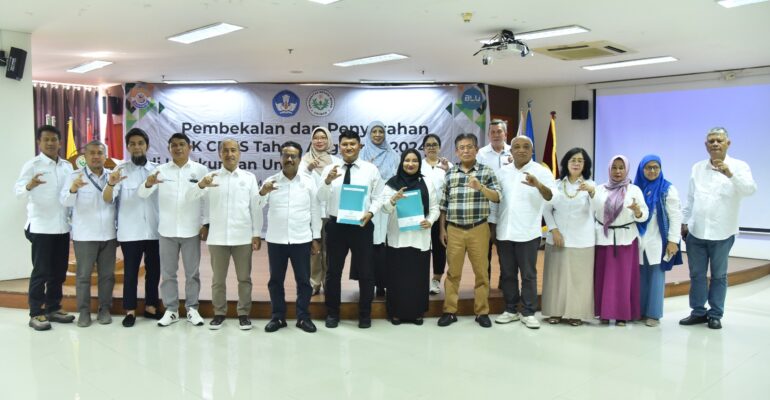 Rektor Universitas Negeri Medan Prof. Dr. Ir. Baharuddin, ST., M.Pd. menyerahkan Surat Keputusan (SK) Calon Pegawai Negeri Sipil (CPNS) Tahun Anggaran 2024 kepada 158 orang Dosen dan 13 orang Tendik di Gedung Digital Library Unimed, Senin (30/6). Turut hadir dalam acara tersebut, Ketua Senat