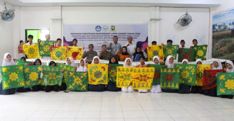 Dalam upaya melestarikan budaya daerah dan meningkatkan keterampilan dalam pelajaran seni budaya materi membatik, tim dosen dan mahasiswa Universitas Negeri Medan melaksanakan Program Kemitraan Masyarakat (PKM) dalam mengembangkan dan mengimplementasikan desain motif batik etnis Melayu untuk meningkatkan kompetensi guru dan siswa. Acara ini diselenggarakan kerjasama