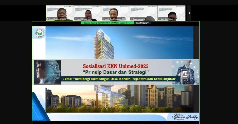 Dalam rangka mempersiapkan proses Kuliah Kerja Nyata (KKN) Tahun 2025 berjalan optimal dan sebagai bentuk nyata pengabdian mahasiswa kepada masyarakat. UNIMED menggelar kegiatan Pembekalan Dosen Pendamping Lapangan (DPL) melalui virtual zoom meeting pada Kamis, (19/6). Tema KKN kali ini adalah Bersinergi Membangun Desa Mandiri, Sejahtera