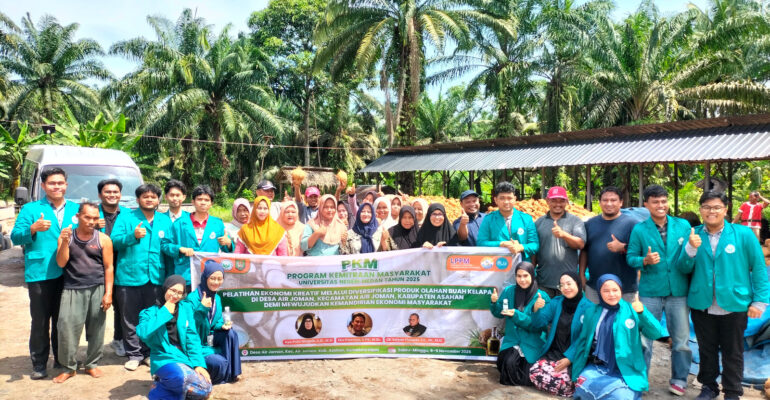 Tim dosen dari Universitas Negeri Medan berhasil melaksanakan kegiatan pengabdian masyarakat bertajuk “ Pelatihan Ekonomi Kreatif melalui Diversifikasi Produk Olahan Buah Kelapa di Desa Air Joman, Kelurahan Air Joman, Kabupaten Asahan demi Mewujudkan Kemandirian Ekonomi Masyarakat”. Kegiatan ini berlangsung selama dua hari, yaitu pada hari Sabtu dan Minggu, tanggal 8-9 November 2025, serta mendapat sambutan antusias dari masyarakat setempat, khususnya kelompok pekerja yang tergabung dalam Usaha Pengolahan Kelapa Garuda Jaya.