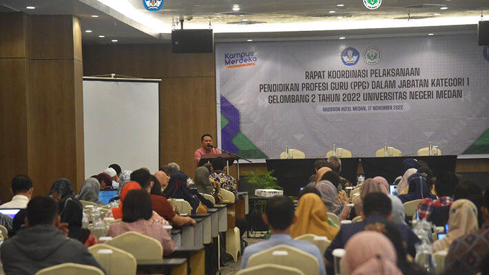 Universitas Negeri Medan menggelar Rapat Koordinasi Pelaksanaan PPG Dalam Jabatan Kategori I Gelombang 2 Tahun 2022 di Hotel Radisson Medan (17/11). Rapat Koordinasi dilaksanakan untuk meningkatkan proses pelaksanaan PPG Daljab Kategori I Gelombang 2 yang telah berjalan agar dalam pelaksanaannya dapat berlangsung dengan lancar sampai