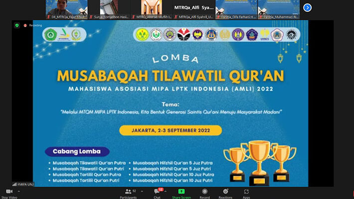 Mahasiswa Fakultas Matematika dan Ilmu Pengetahuan Alam (FMIPA) Unimed menoreh 7 Medali dalam Lomba Musabaqah Tilawatil Qur’an (MTQ) Mahasiswa Asosiasi MIPA LPTK Indonesia (AMLI) 2022 yang diadakan di Universitas Negeri Jakarta (UNJ) yang bertema “Melalui MTQM MIPA LPTK Indonesia, Kita Bentuk Generasi Saintis Qur’ani Menuju